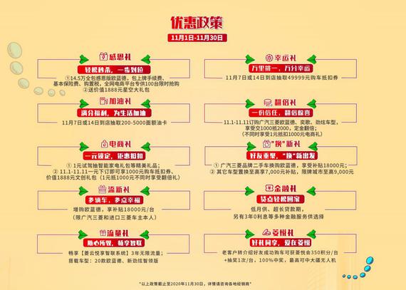 适逢双十一到来之际,广汽三菱还为广大消费者准备了终极“麻辣十重礼”。即日起,仅需14.5万即可全包闪购欧蓝德,电商平台专供100台限时抢购。11月7日或14日到店还有机会抽取49999元购车抵扣券和200-5000面额油卡。11月1日至11日期间,订购欧蓝德、奕歌、劲炫车型,享受交1000抵2000“翻倍礼”;电商平台下订车型还可享受1000元购车抵扣券、价值1888元文创礼包等惊喜好礼。此外还有多重换购补贴、多项金融服务等丰富福利,更多优惠详情请咨询当地经销店。